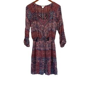 Lucky Brand Burgundy Floral 3/4 Sleeve V-Neck Peasant Mini Dress, Boho, M