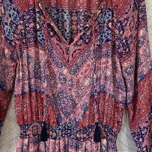 Lucky Brand Burgundy and Navy Boho Peasant Mini Dress in Floral print, Size M