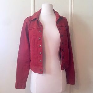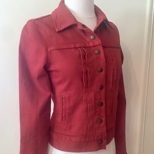 Super cool jean jacket from Lucky Brand, size extra small. rusty / burnt orange denim. 8 antiqued bronze snap buttons up the front. Pin-tucking detail. 2 side pockets.Buttons at the cuffs of the sleeves. Great, gently worn condition.