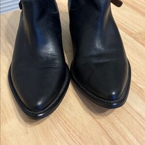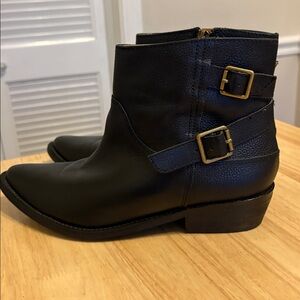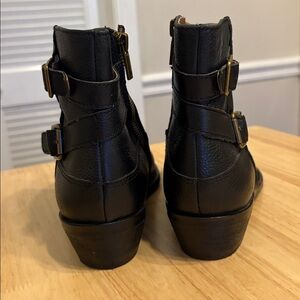 Lucky Brand Caelyn Black Leather Boots Booties Western Gold Buckle Cowboy Boho. Size 8 in good used condition. 1-1/4" block heel, almond-toe with inner ankle zipper closure. Leather upper.
