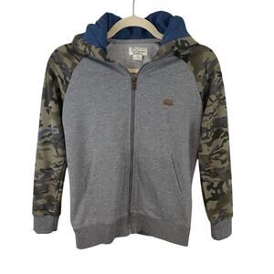 Lucky Brand Camo Sweatshirt Hoodie. Size Small (see measurements below to ensure fit). Gray with camo print sleeves & hoodie. Front zip and pouch pockets. Contrast blue hoodie lining. Excellent used condition.