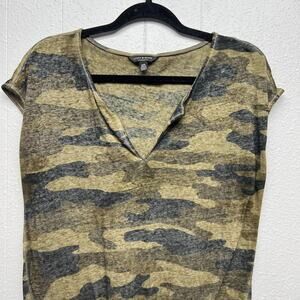 Lucky Brand women's burnout top. Camouflage print. V-neck. Cap sleeves. Tie front. Lightweight. In good used condition. No stains, tears or holes.