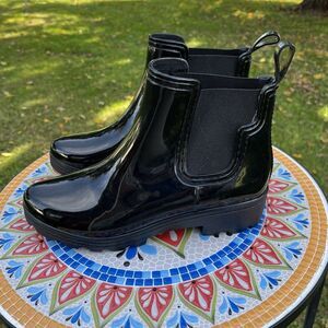 Keywords: Lucky Brand rain boots, black Chelsea boots, waterproof ankle booties, shiny rubber slip-on, womens size 8 boots, stylish rain shoes, glossy pull-on boots, casual wet weather footwear.