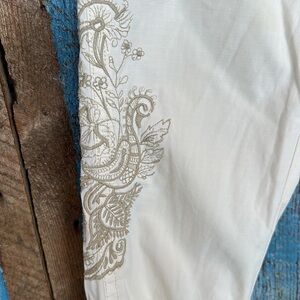 Here is a fun pair of Lucky Brand Cream Mid Rise Easy Fit Capri Women’s Size 25 in great used condition with signs of wear as shown. Measurements are approximately 14 inch waist when flat, 7.5 inch rise and 19 inch inseam.