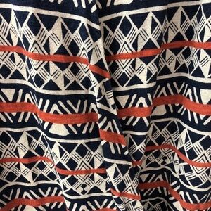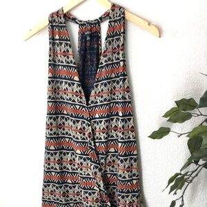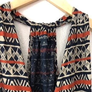 A loose fitting tank top with a semi-elastic bottom. Criss cross front with the top sewn so no flashing! Nice muted fall colors.