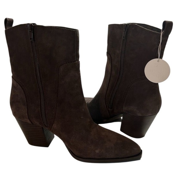 Stylish dark brown ankle boots. Suede finish with side zippers. Chunky heel for comfort.