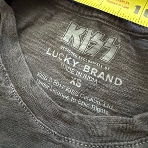 Rock-inspired baby tee from Lucky Brand. Dark gray faded cotton, intentionally distressed look. Features large “KISS” logo embroidered in beads across the chest. Tagged XS, fits XS-S.