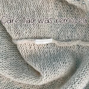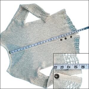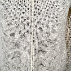 The Lucky Brand pullover sweater is ivory cream in color. Medium. Loose fit. It features a V-neckline, long open knit sleeves, & bottom hem. The back has a center seam with an inverted pleat near the hem, adorned with three small buttons. Cotton. Due to light & screen variations, colors may vary slightly from the images.