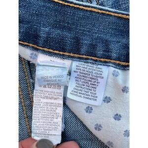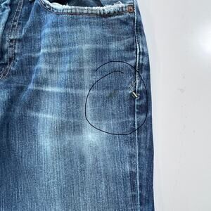 Lucky Brand Denim 121 Heritage slim jeans. Medium blue wash with gold stitching. 5 pocket design and zip fly. Distressing especially along bottom hems and small hole on right knee. Small dark spot on front below pocket (see pic) Men's size 30 x 30, see measurements below. 98% cotton, 2% spandex.