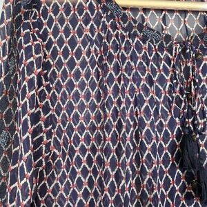 Features : Navy blue, red, and white diamond pattern blouse, Peasant style, long billow sleeves, beaded embellishments along Shoulders and arms, elastic waistline, drawstring cuffs, self-tie tassel neckline, round neckline, semi-sheer, polyester, boho, relaxed, casual