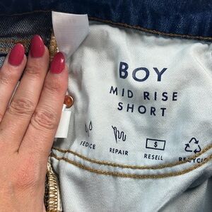 These mid-rise boyfriend-style shorts feature a stylish distressed look and a sustainable cotton-hemp blend for comfort and durability. Perfect for casual summer days. Gently worn with no flaws.
