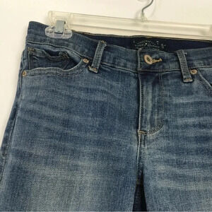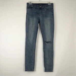 Lucky Brand Distressed Stella Skinny Jeans. Womens Size 2/26. The knee has a ripped or a distressed look. The jeans have pockets. 95% Cotton, 3% Polyester, 2% Spandex. No modeling or trades. F31