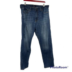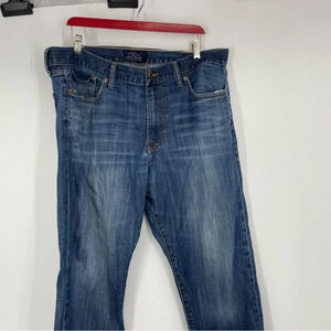 Lucky You! Already distressed and worn in. Size 36 x 30. The back pocket has wallet wear marks and the hem is ripped.