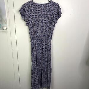 The Lucky Brand Dress for women in size Large features a colorful geometric pattern with a V-neckline and flutter sleeves, making it perfect for a casual occasion. Made from a lightweight cotton fabric with a rayon blend, this midi length dress offers a tie waist closure and pockets for added convenience. Ideal for the summer and spring seasons, this A-line dress is machine washable and comes in a vibrant multicolor palette, bringing a touch of joy to your wardrobe.