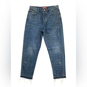 Authentic Lucky Brand Drew Mom jeans in a high rise tapered fit. Made from 100% cotton for that classic rigid denim feel. Features a medium wash with intentional fading, subtle paint splatter details, and raw cut hems for a lived-in, vintage-inspired look.