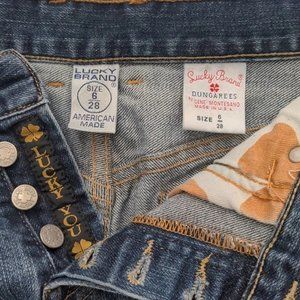 Size 28/6. Lucky Brand Dungarees Low Rise Button Fly Flare Jeans. Have only cold wash and line dried jeans. No stretching, holes or stains!