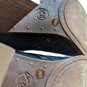 •Upper suede leather, stacked heel, synthetic lining and rubber outsole.