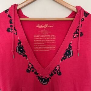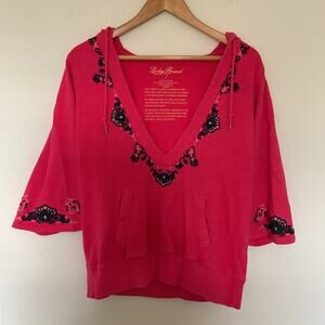 Lucky Brand Embroidered Boho Deep V-Neck Hoodie Sweatshirt L Pink Fairy Grunge