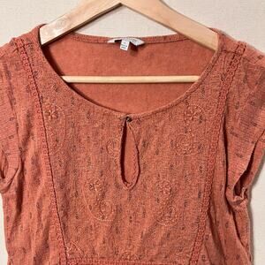 Lucky Brand Embroidered Keyhole Cut Out Top Pink Short Sleeve Blouse Size S. 52% linen, 48% lyocell.