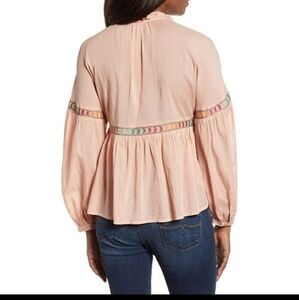 Lucky Brand takes your casual look a pretty boho-inspired direction with this semi-sheer peasant top, designed with embroidered trim and long blouson sleeves.