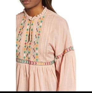 Keyhole and button detail at front neckline; embroidered at waist, sleeves and top front