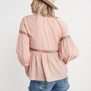 This boho-chic peasant top features an embroidered design along the front and long blouson sleeves that add intrigue and 70's-inspired style