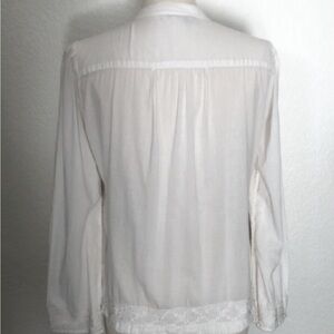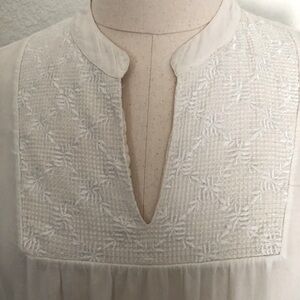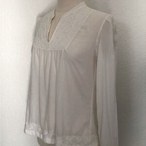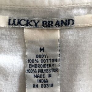 This Lucky Brand top, size medium is in good pre~loved condition. It is a white pullover blouse made of lightweight cotton. It features an embroidered yoke, hemline and sleeve trim in a Bohemian style. Measurements in photos.