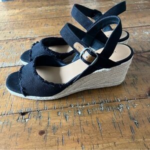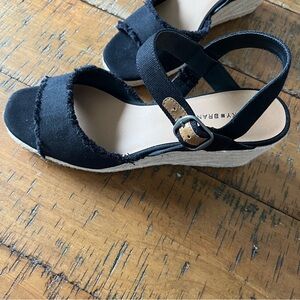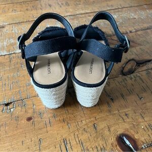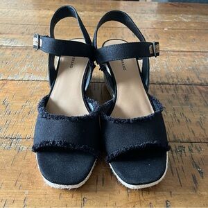 Stylish navy espadrille wedges. Features adjustable buckle strap. Perfect for casual outings.