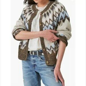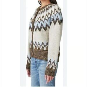 A super soft, thick and plush button down cardigan in gray, blue, beige, brown and black. Cozy warm and in excellent clean preloved condition.