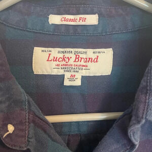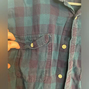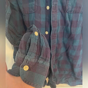 It is wrinkly, but no stains or holes found during my inspection. Blue and purple like color checkered pattern.
