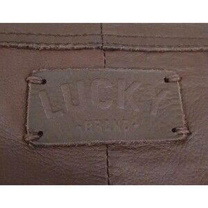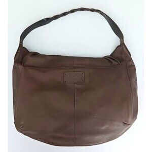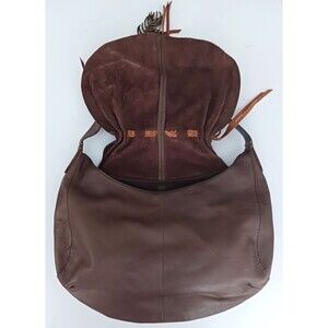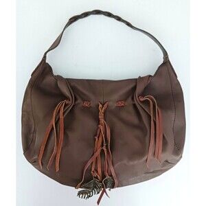 The Lucky Brand Flap Front Hobo Brown Leather Hollywood & Vine Brass Feather Bag Charm is a stylish and spacious hobo bag made of genuine leather with a solid brown exterior. It features a crescent shape with brass hardware accents and a saddle brown contrast stitch and fringe detail. The bag has a magnetic inner closure and a braided shoulder strap handle in brown leather, making it comfortable and easy to carry. Additionally, it is lined and includes an inner pocket for organization. Bag has a unique bohemian or southwestern themed design, perfect for adding a touch of flair to any outfit. The feather brass bag charms add a chic touch to the overall look of the accessory. 16X3X11 overall size. Excellent pre owned condition, bag is clean inside and out, no stains , rips or odors. Beautiful.