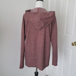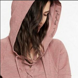 Lucky Brand Fleece Lace Up Pullover Hoodie/ sweatshirt. Beautiful mauve color. Has “celebrate everything” and a peace sign inscribed in the hood in metallic writing. Super soft and cozy, would look great paired with leggings perfect for those days when you just want to dress comfy! Size large. Good preloved condition.63% polyester, 34% viscose, 3% elastane. Lucky Brand Tops Sweatshirts & Hoodies