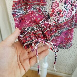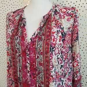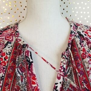 Lucky Brand floral handkerchief high-low pop over top. Buttons half way down. Mandarin drawstring collar. Tie sleeves. Size small. The fabric content tag was missing.