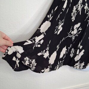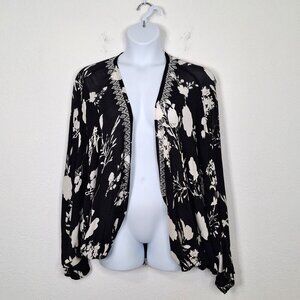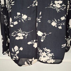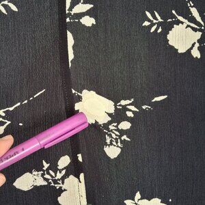 Pre-owned, good condition w/ repair. No stains or other visible flaws. Neutral abstract floral print in cream over a black background. Kimono style. Embroidered accent at and around neckline. Long bat sleeves kimono. Size per tag: O/S. Fabric: 100% Viscose. Size per tag does not guarantee desired fit, please see pictures for measurements.