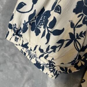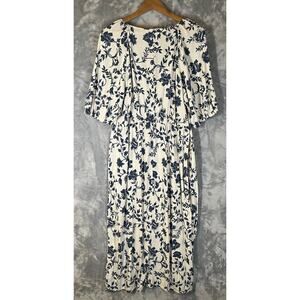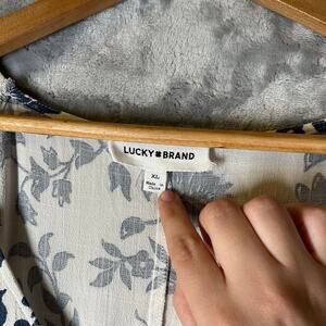 Cream and blue floral dress from Lucky Brand. Short puff sleeves, v-neckline, faux covered button placket down front. Babydoll bustline. Rayon/spandex blend. Very comfortable and flattering. Size XL. Excellent condition.