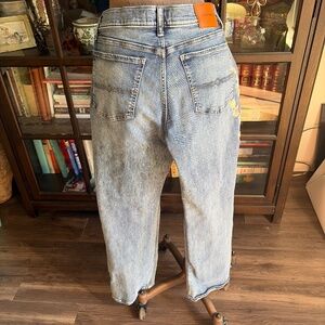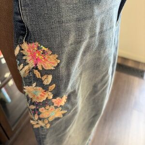 beautiful flower embroidery on the classic straight leg stretch Jean. Medium wash with distressing. Excellent condition.