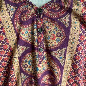 Comfy, floaty, gauzy top with loose elastic at the wrists and shirt bottom. Faux button placket in front. Worn only a couple of times;