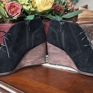Lucky Brand Genuine Suede Black Lace Up Wedge Ankle Boots Booties w/ Side Zipper.