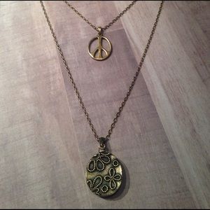 Lucky Brand Gold & Jade layered Necklace • longer part jade circle stone • shorter part peace sign • clasp works