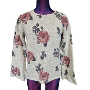 Lucky Brand Gray Floral Scoop Neck Flare Sleeve Sweater Size Small Women's