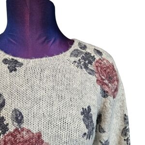 Features light gray tight knit wool blend fabric, romantic rose print, flared long sleeve, floral pull over sweater, scoop neck, tonal stitching, falls at waist, cottagecore style.