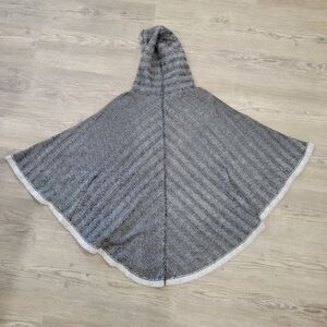 Stylish gray hooded poncho with elegant white trim. Perfect for transition weather layering.