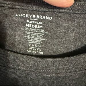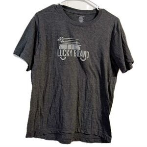 This Lucky Brand tee features a classic short-sleeve design in a versatile gray color, perfect for casual wear. The shirt showcases a stylish graphic on the front, adding a touch of personality to your outfit. Made from a comfortable cotton blend, it offers a relaxed fit for everyday comfort.