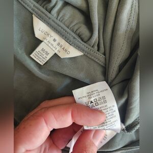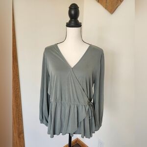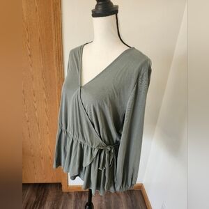 Lucky Brand Green Bishop Sleeve Wrap Shirt, great pre worn condition, size medium, pit to pit 19 inches, length 22.5 inches, wrap tie and ruffle, long sleeves with elastic ends, 72% modal 28% polyester