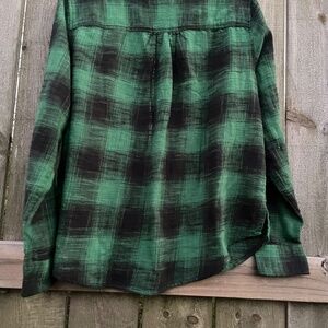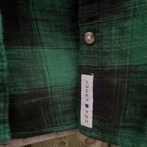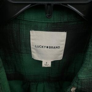 Classic and cozy Lucky Brand plaid shirt in rich green and black tones. Designed with a relaxed fit, button front, and soft woven fabric—perfect for layering over a tee or styling on its own. Great for casual wear, fall outfits, or a laid-back grunge vibe.