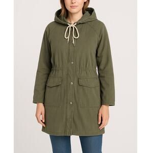 This Lucky Brand green hooded parka jacket blends utility and effortless style. With its sustainable Tencel™ Lyocell fabric, it’s lightweight, breathable, and perfect for layering. The drawstring hood and waist give it a customizable fit, while the large front pockets add functionality. A versatile everyday piece for transitional weather.