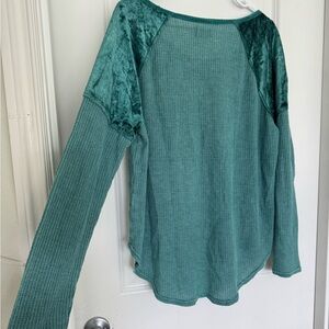 Chic green sweatshirt with waffle knit texture. Features velvet accents on shoulders. Ideal for casual wear.