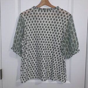 Lucky Brand Green and White Patterned Women's Top. Sheer Sleeves. Large