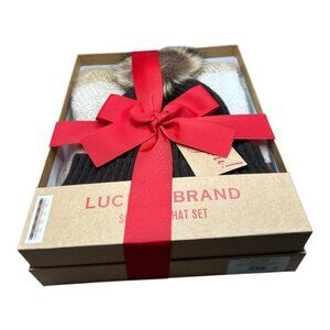 Lucky Brand Hat and Scarf Set Brown Ribbed Beanie W/Faux Fur Pom & Plaid Scarf