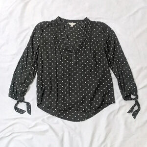 Crafted from an all-over polka dot print, this every day blouse is spiced up with a flowy and fun silhouette. Detailed with pleating around the neck and tied sleeves for added wow.